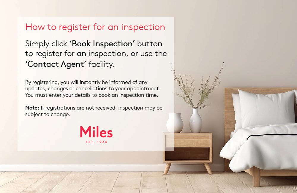 Simply click 'Book Inspection' button to register for an inspection, or use the 'Contact Agent' facility. By registering, you will instantly be informed of any updates, changes or cancellations to your appointment. Applications will be accepted after you have attended an open for inspection.
