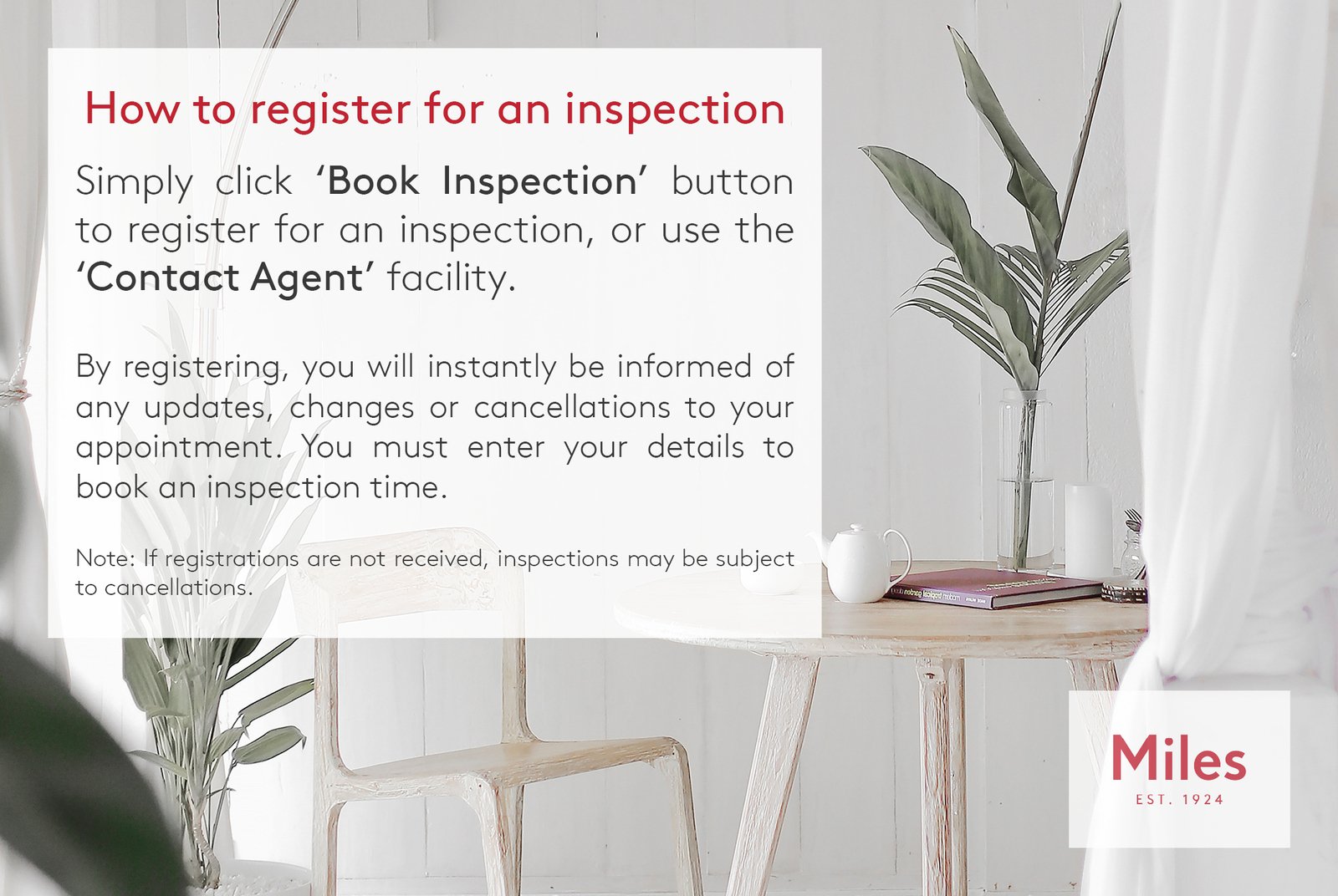 Simply click 'Book Inspection' button to register for an inspection, or use the 'Contact Agent' facility. By registering, you will instantly be informed of any updates, changes or cancellations to your appointment. You must enter your details to book an inspection time. Please note there is no entry without an appointment.