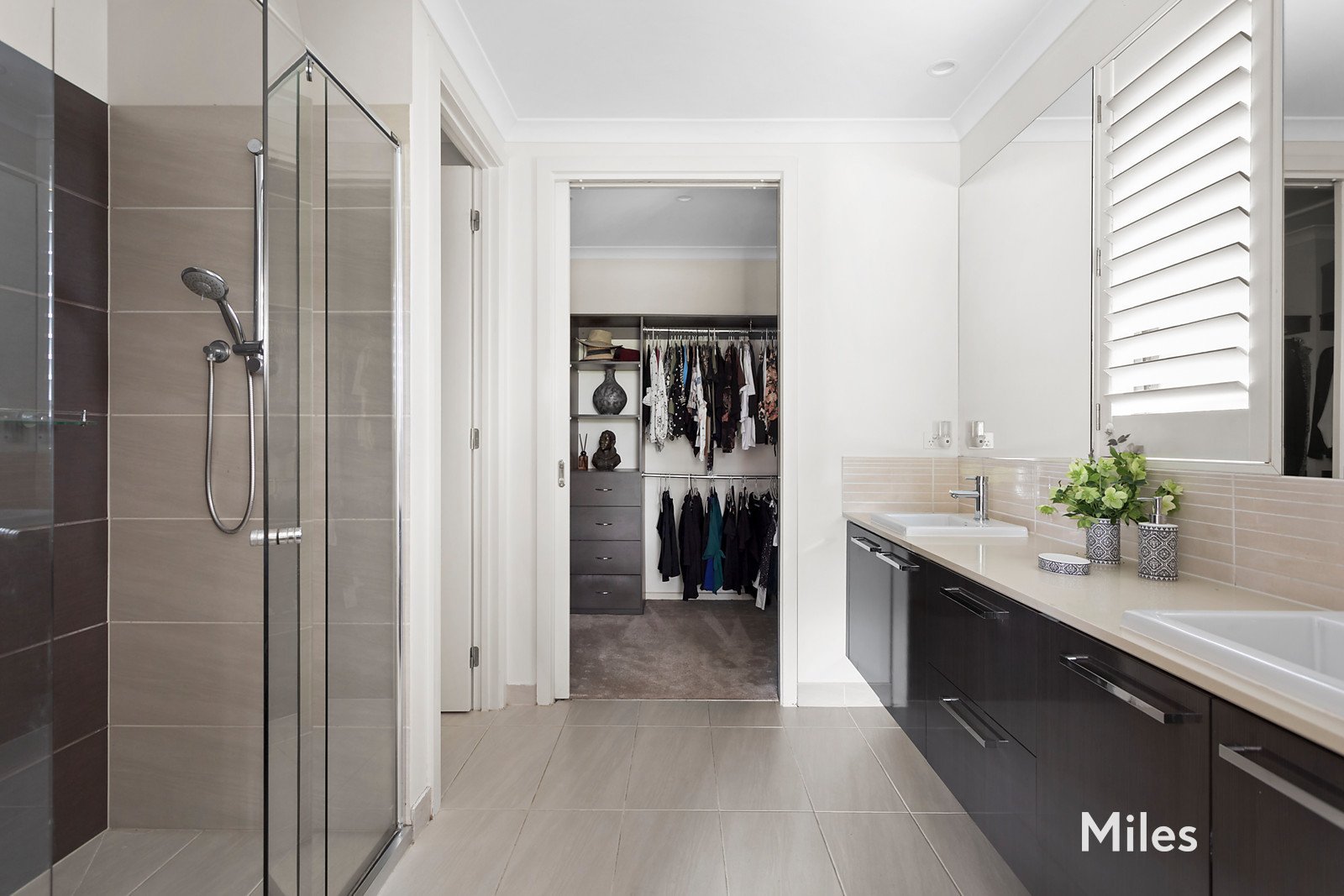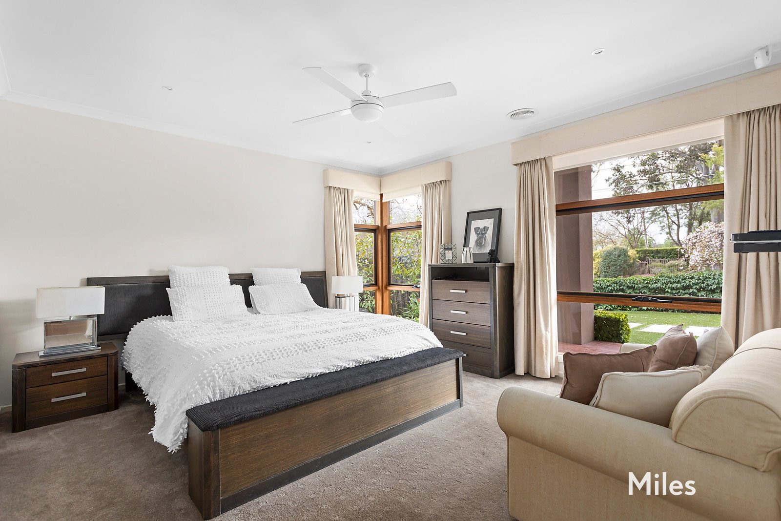 An impressive sense of space is instantly conveyed by a wide hallway on polished timber floorboards revealing a light-filled main bedroom suite with double-door entry that includes a ceiling fan, walk-in robe and a twin-vanity ensuite with an oversized shower.