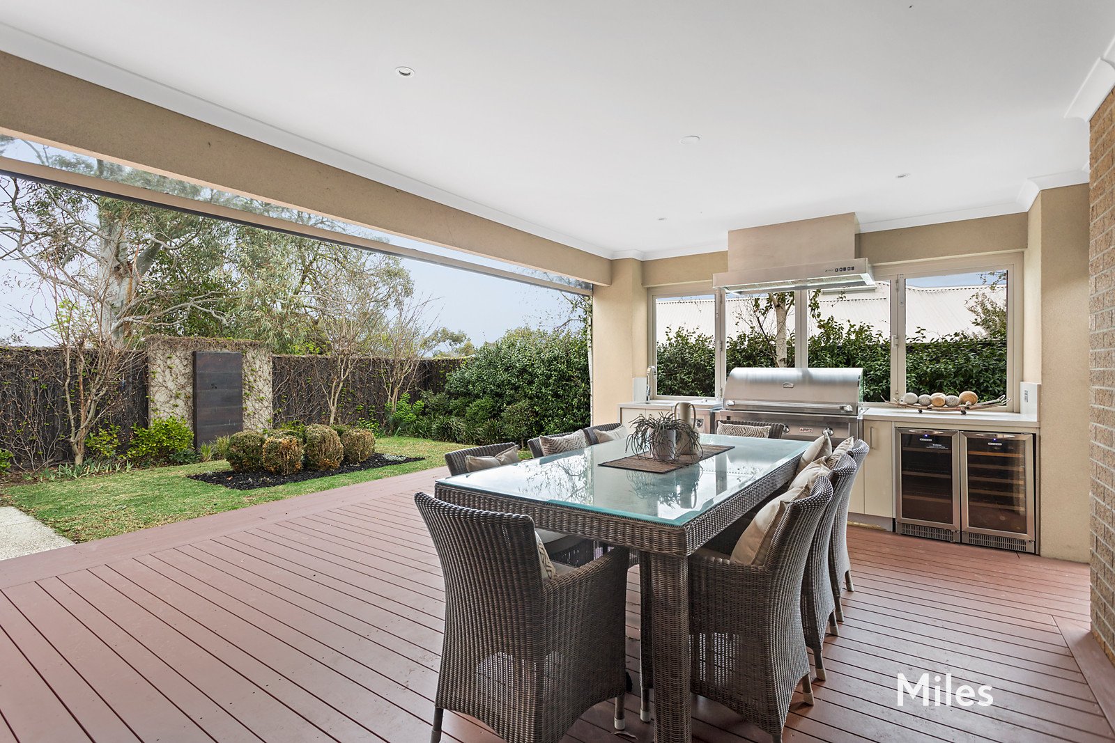 Backdropped by secluded garden greenery with a tranquil water feature, an undercover alfresco deck with bistro blinds and a cafe window is flawlessly tailored for year-round gatherings highlighted by a stone-topped bar, stainless steel BBQ, sink and a double-door Vintec wine fridge.