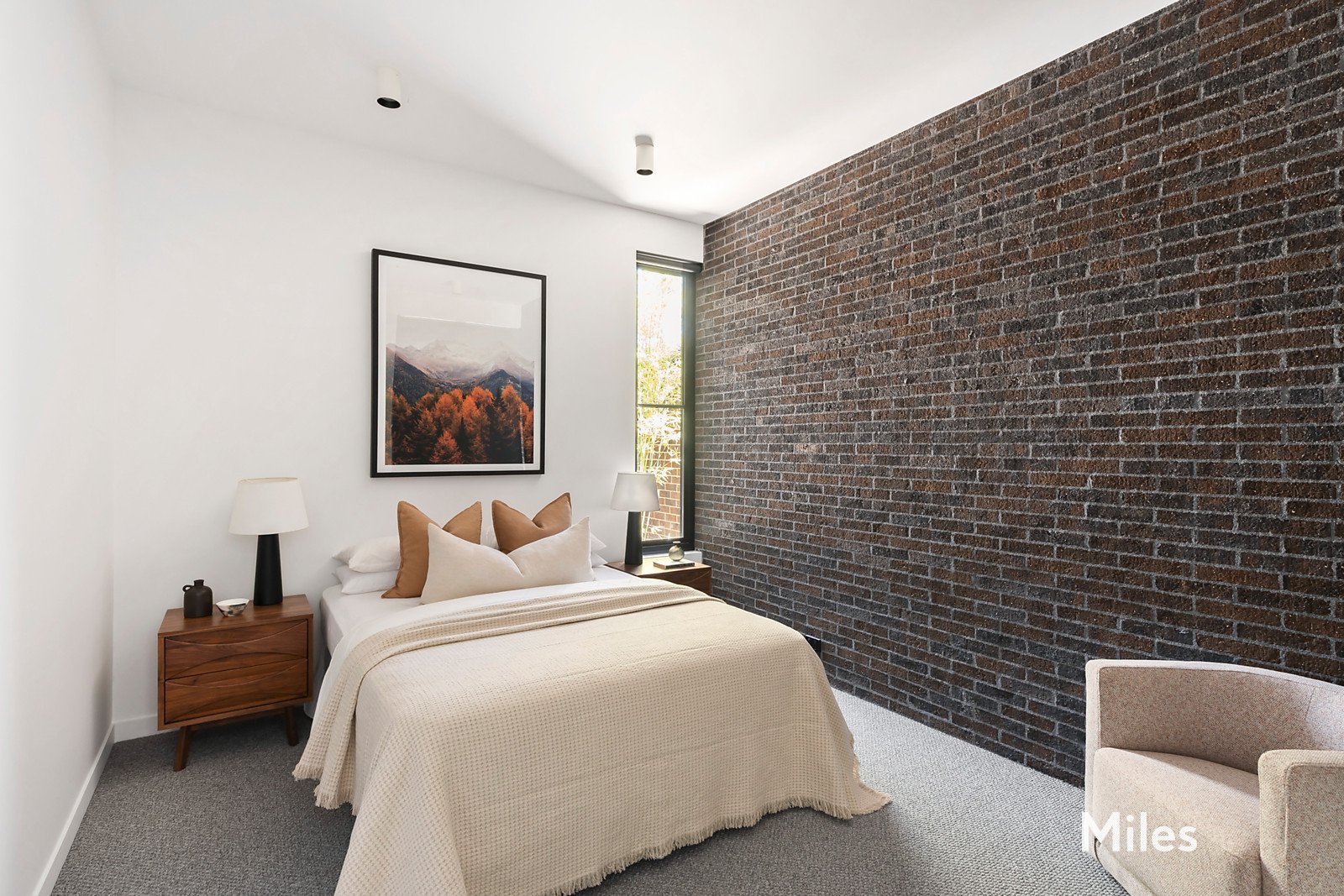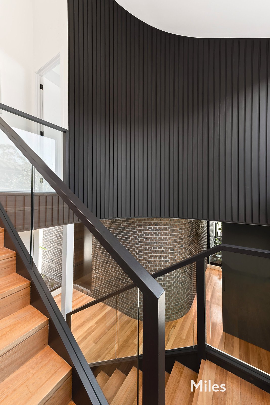 Quality Daniel Robertson brickwork and charred Yakisugi timber enhance the stunning sculptural form of this double-glazed domain introduced by a dramatic entrance hall on blackbutt timber flooring, where a spectacular, contrasting curved wall sweeps upward to a soaring two-level void.