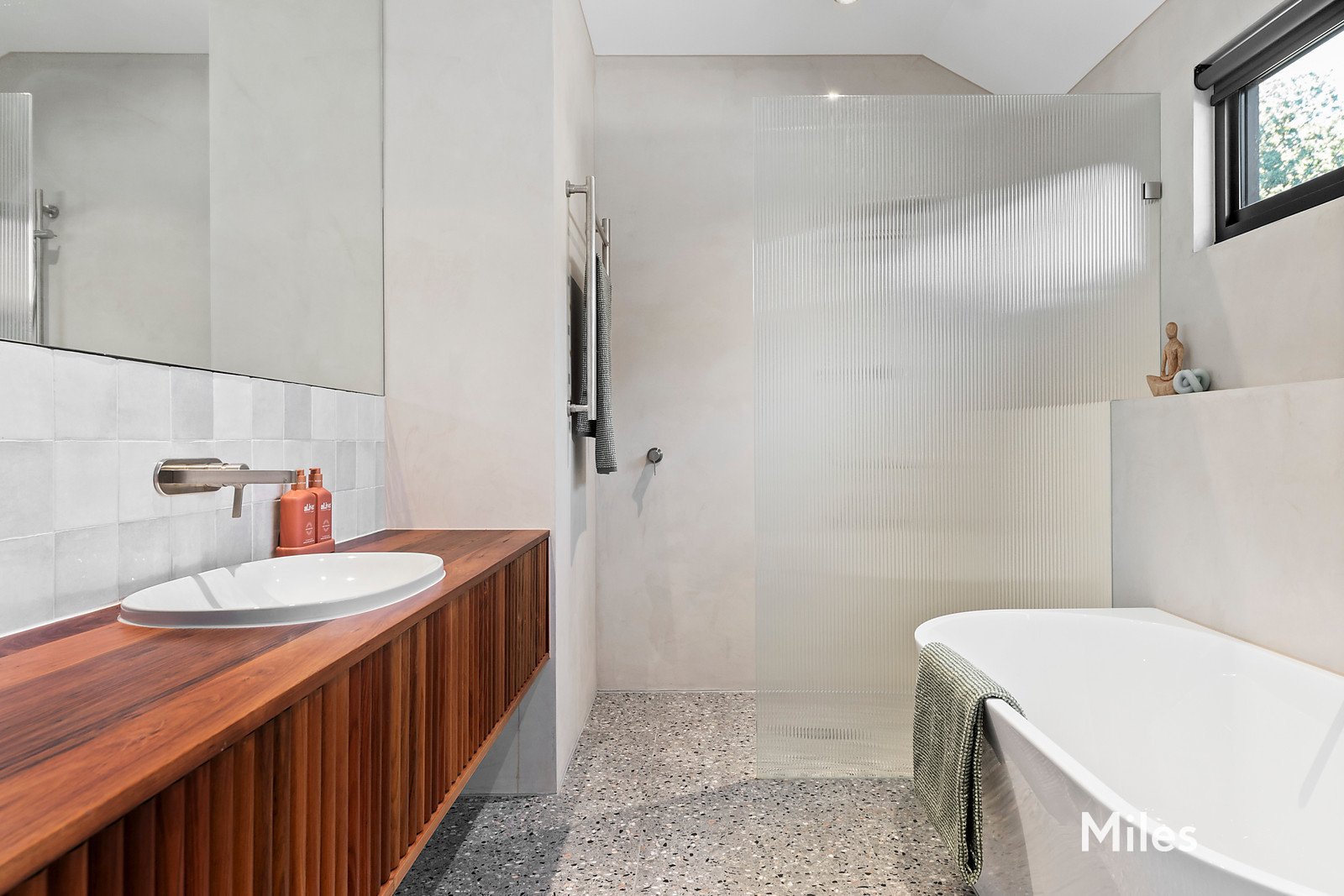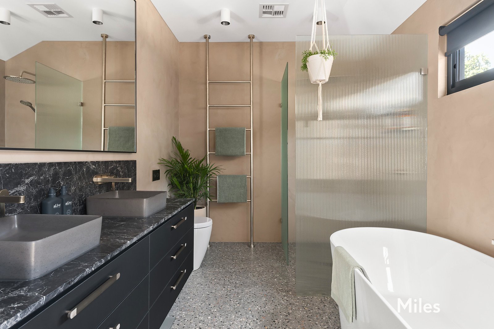 Accommodation begins on the ground-floor with a guest's bedroom suite (WIR, ensuite) before extending on the upper-level to four additional bedrooms (three with built-in robes) including a beautiful main with a fitted walk-in robe and luxury ensuite (freestanding bath, fluted-glass shower, heated towel pole), all complemented by an impressive family bathroom and a vast north-facing rumpus room.